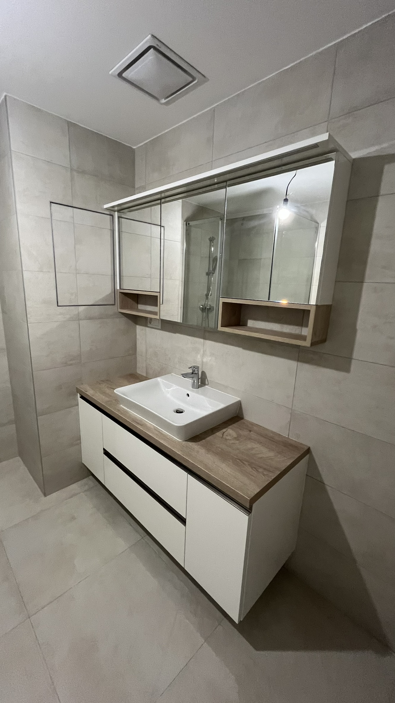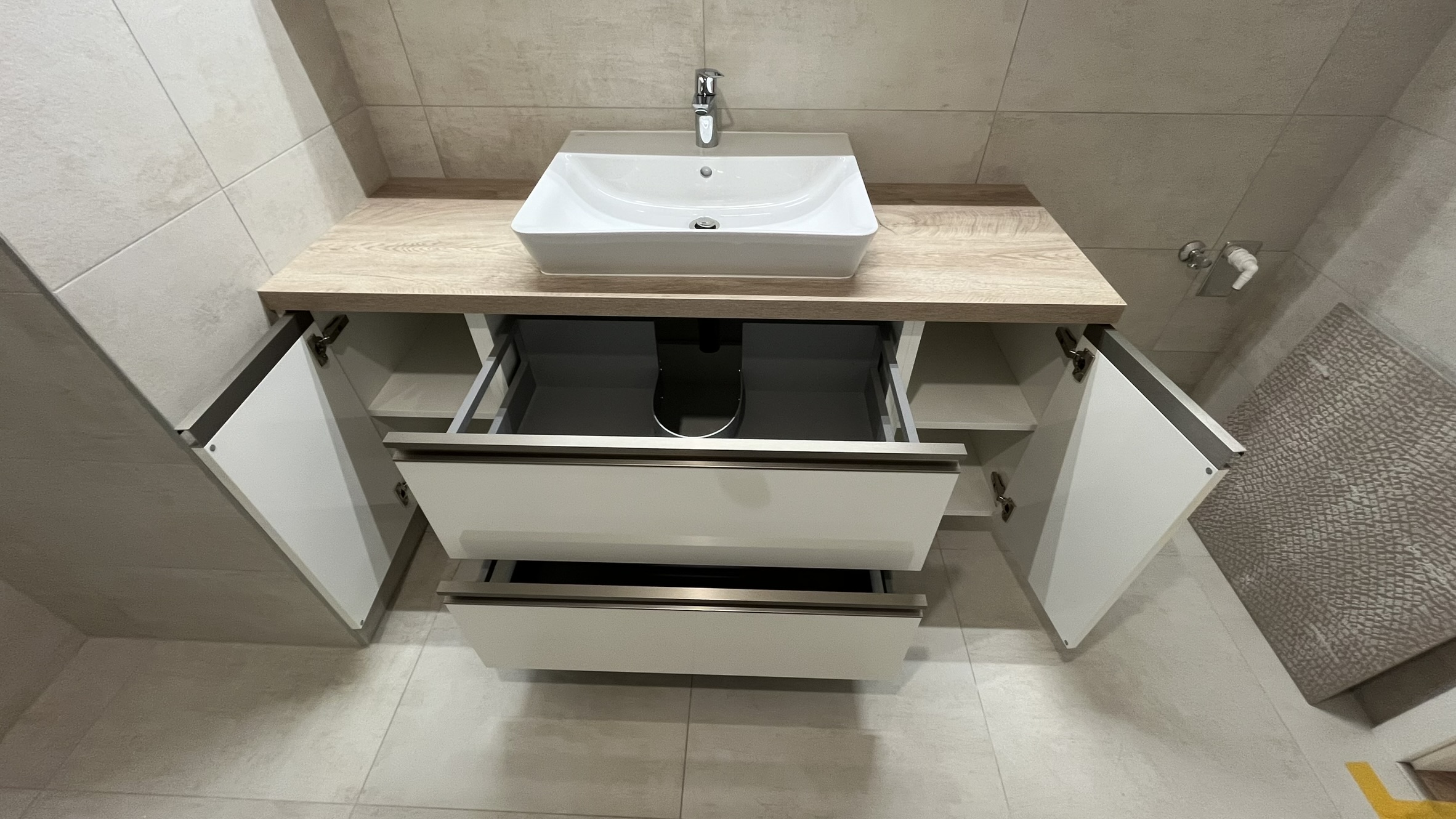 Pro výrobu jsme použili kvalitní materiály s odolnou povrchovou úpravou, které obstojí i v náročném prostředí koupelny. Každý detail – od výběru dekoru až po úchytky a kování – byl laděn s důrazem na funkčnost i estetiku.