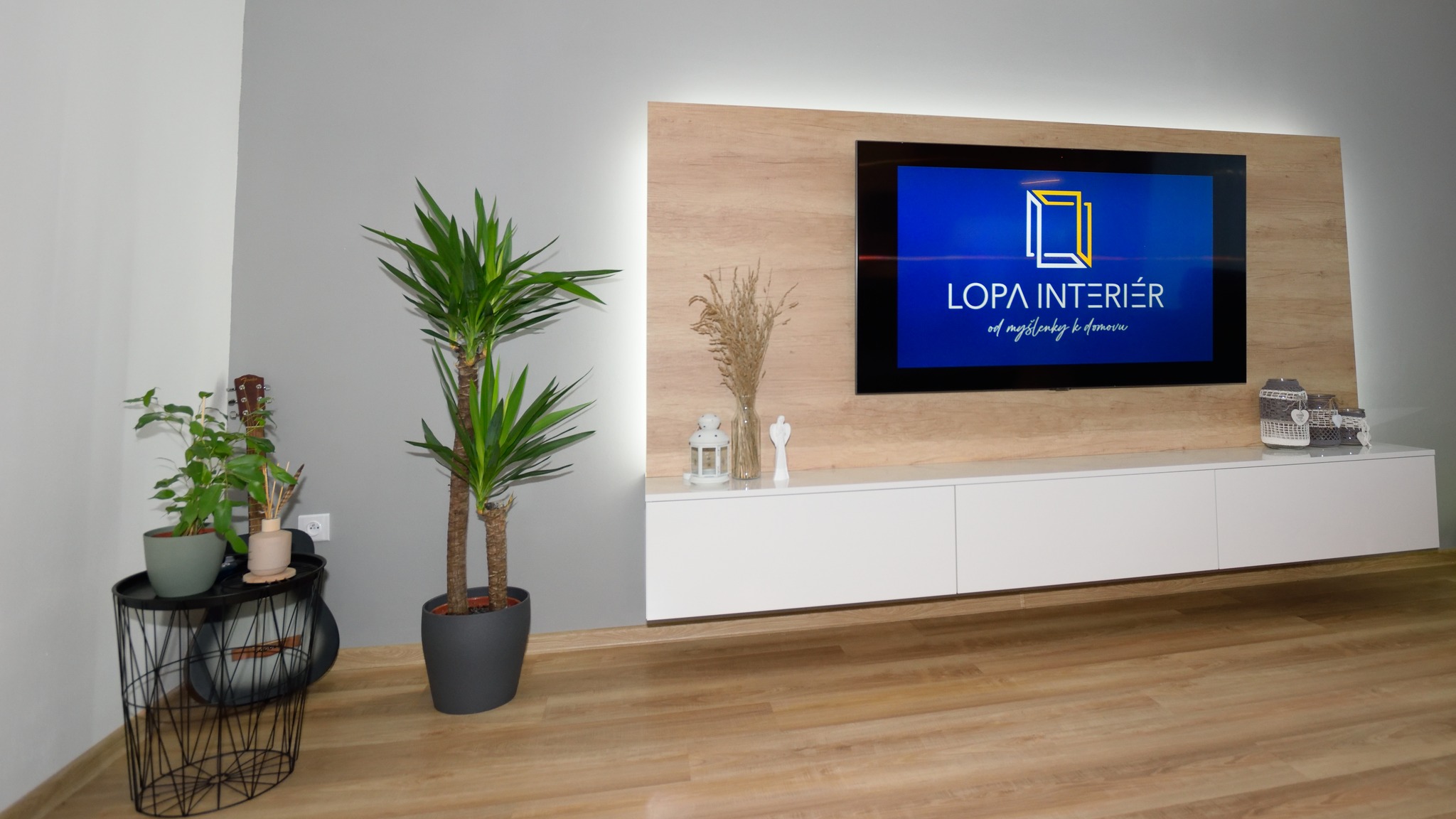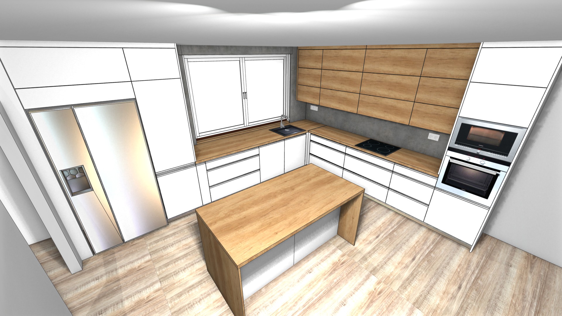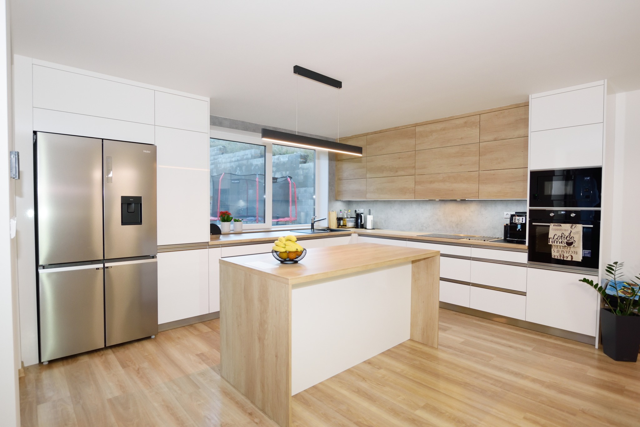 Bílý lesk se na kuchyňské lince dobře udržuje, dekor dřeva dodá příjemnému vzhledu a v pozadí s betonovým obkladem dřevo hezky vyniká. Designově jsme zde vsadili na jednoduché a čisté linie se zabudováním americké lednice.