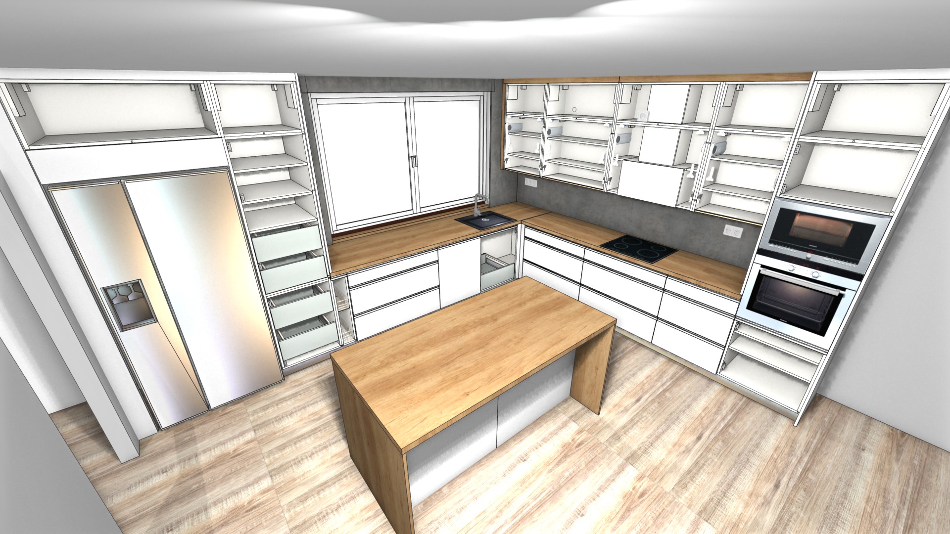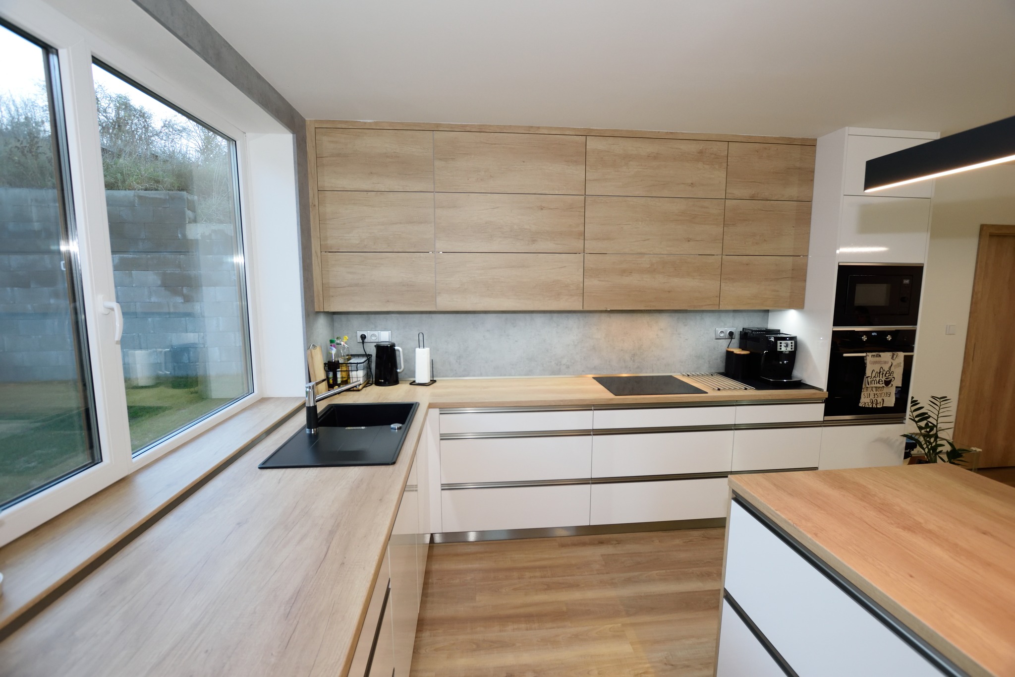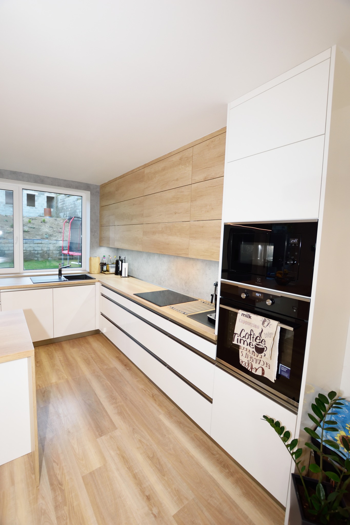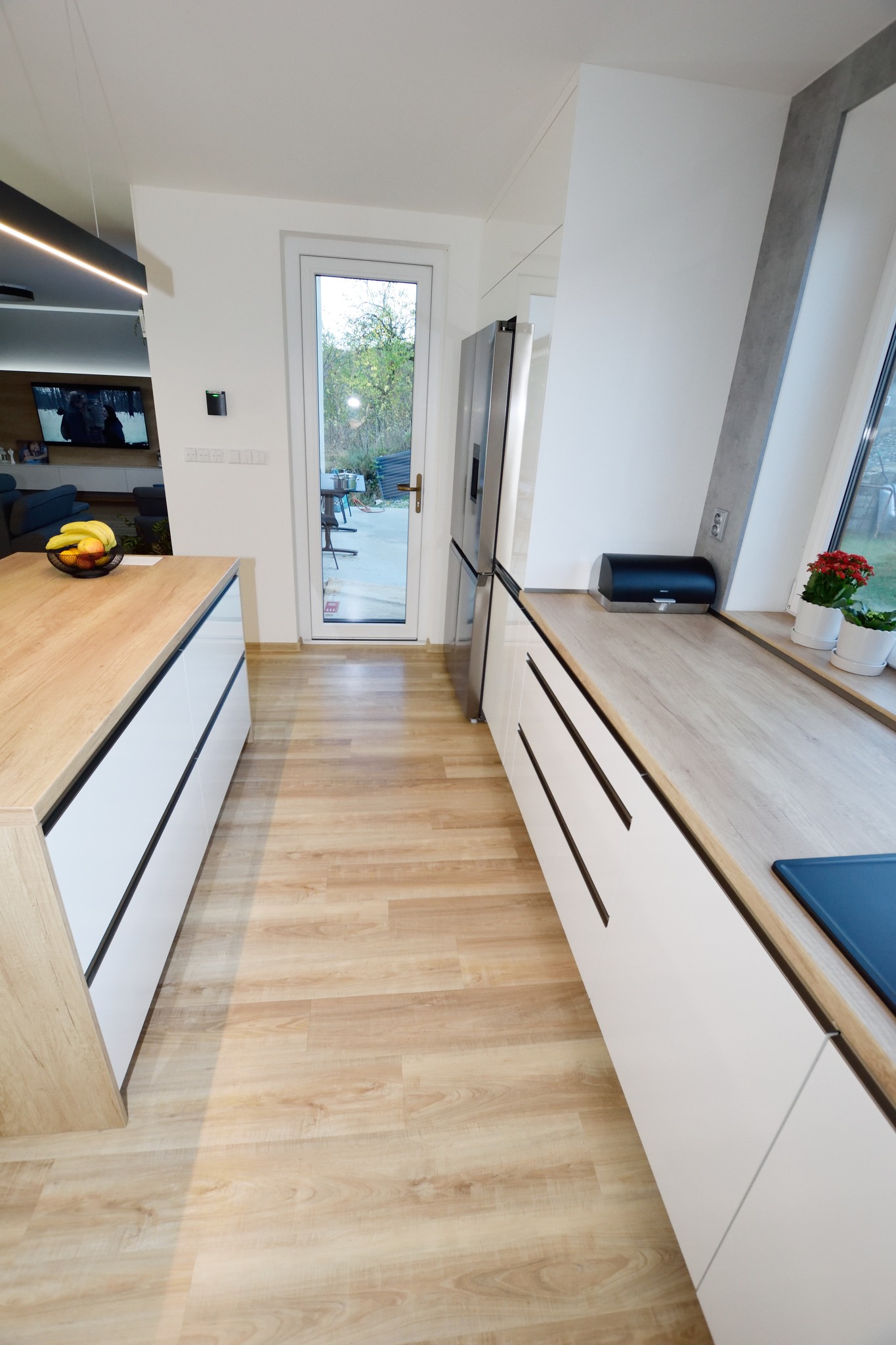 Dvířka v bílém lesku, obklad Egger F286 ST9, dekor dřeva Egger H3331 ST10. Spotřebiče značky Electrolux, dřez + baterie Schock Cristadur, kování BLUM.